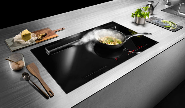 Kochfelder bilden den zentralen Punkt einer Küche. Innovatives Küchen- und Wohndesign verlangt heute neue Lösungen im Bereich der Dunstabzugssysteme. Die nützlichen Küchengehilfen der Premiummarken Bora, Gaggenau, Concept Swiss AG oder O+F A-Line sind direkt mit dem Kochfeld verbunden. Sie saugen beim Kochen die Dünste direkt dort ab, wo sie entstehen, und verhindern, dass sie sich in den Wohnräumen ausbreiten – und bieten noch dazu Kopffreiheit. So ist die Abzugsfunktion der Hubhaube Gourmet XL von Concept Swiss AG direkt in das Induktionskochfeld integriert. Sie öffnet sich automatisch nach oben und ist im Ruhezustand komplett verschlossen.