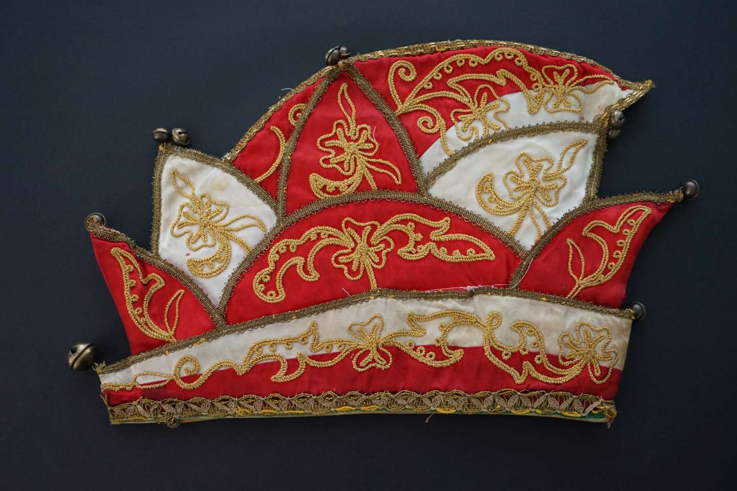 Ministerkappe der Karnevalsgesellschaft Rot-Weiß Ehrang 1952 e. V., 1970er-Jahre, Stoff mit Kurbelsticherei und Glöckchen, Karnevalsgesellschaft Rot-Weiß Ehrang 1952 e. V.,… mehr…