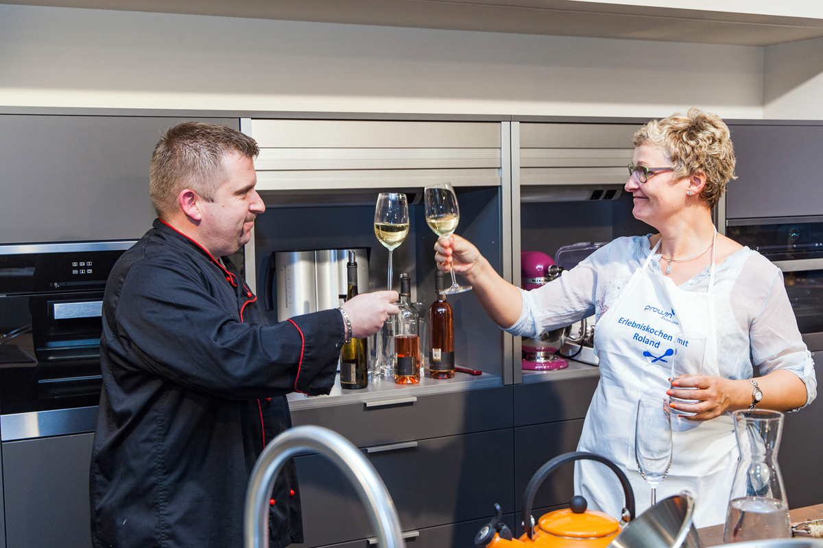 Hier bereiteten die Sieger eines Wettbewerbs der Firma proWin Franzen nach professioneller Anleitung ein köstliches Gänge-Menü zu. Der Fokus lag beim Kochen auf der schonenden Zubereitung im Garer sowie dem Sous-vide-Garen. Zum Einsatz kamen unter anderem Backöfen, Multigarer und Vakuumierer von den renommierten Herstellern Gaggenau und V-Zug. Anschließend konnten die Teilnehmer das Menü mit begleitenden Weinen gemeinsam am großen Esstisch genießen.